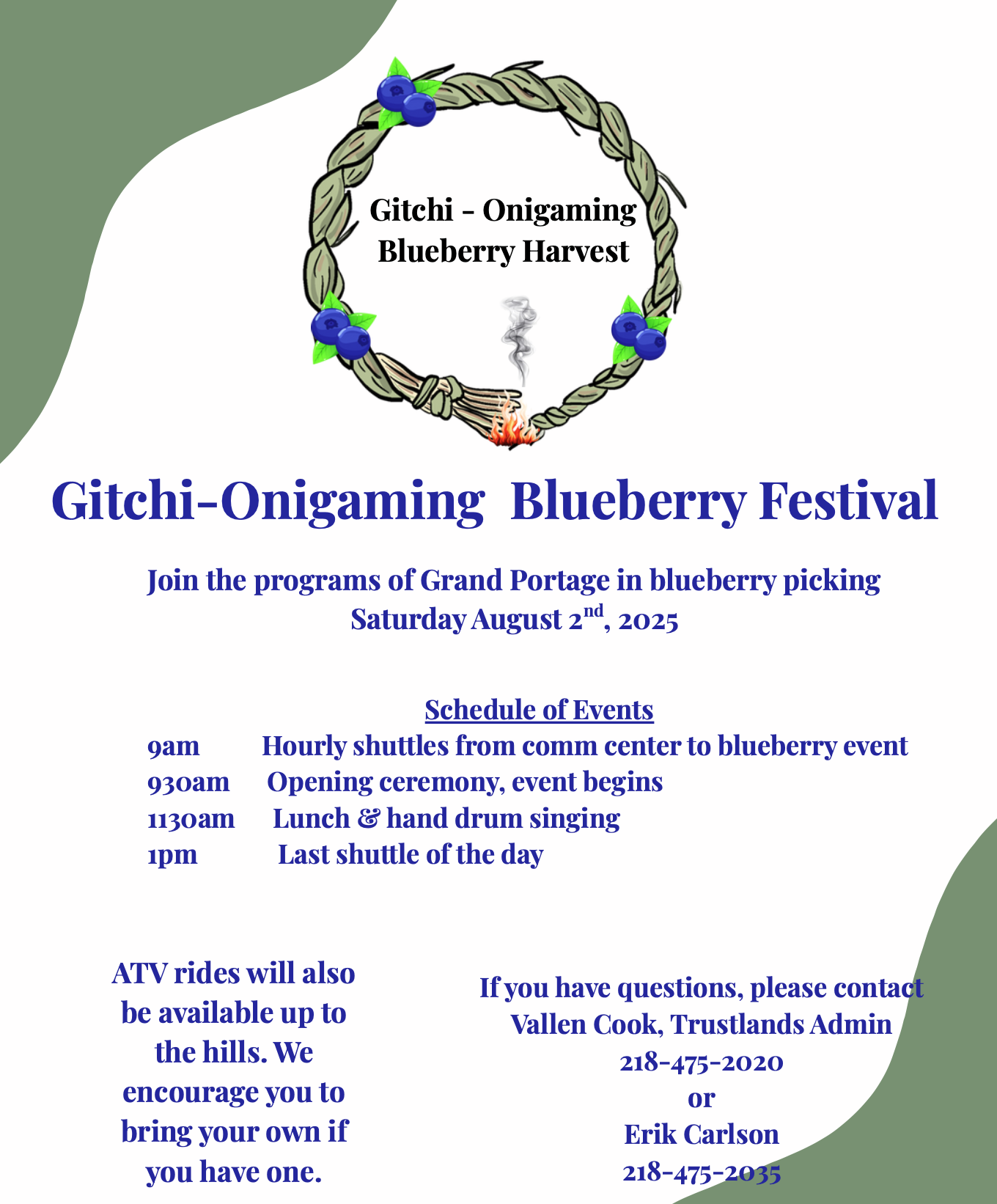 Gitchi-Onigaming Blueberry FestivalJoin us for a day of blueberry picking, food, music, and community! Saturday, August 2ndGrand Portage – shuttles will run hourly from the Community Center to the picking siteSchedule Highlights:• 9:00 am – Shuttles begin• 9:30 am – Opening ceremony• 11:30 am – Lunch & hand drum singing• 1:00 pm – Last shuttle […]